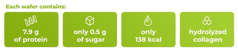 Unlike regular sweets, this protein wafer is full of quality nutrients. It boasts a high protein content, derived from whey isolate and quality collagen. Thanks to their presence, it contributes to muscle growth and maintenance, as well as to bone health. It also has a low sugar content, and the emphasis on quality is also confirmed by the use of carefully selected ingredients.