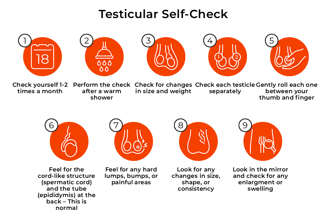 9. Examine yourselves in the mirror. Observe whether you see swelling, changes in skin colour, or enlargement of one of the testicles.