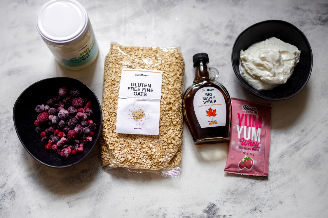 Meanwhile, you can prepare the cream. Put all the ingredients – quark, frozen berries, strawberry protein powder and maple syrup – in a bowl. Mix with a hand blender or whisk until a cream is formed.