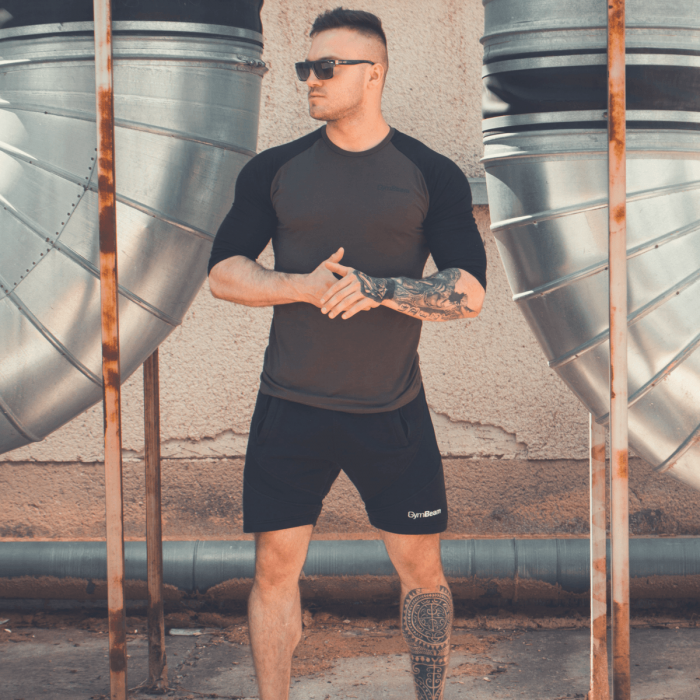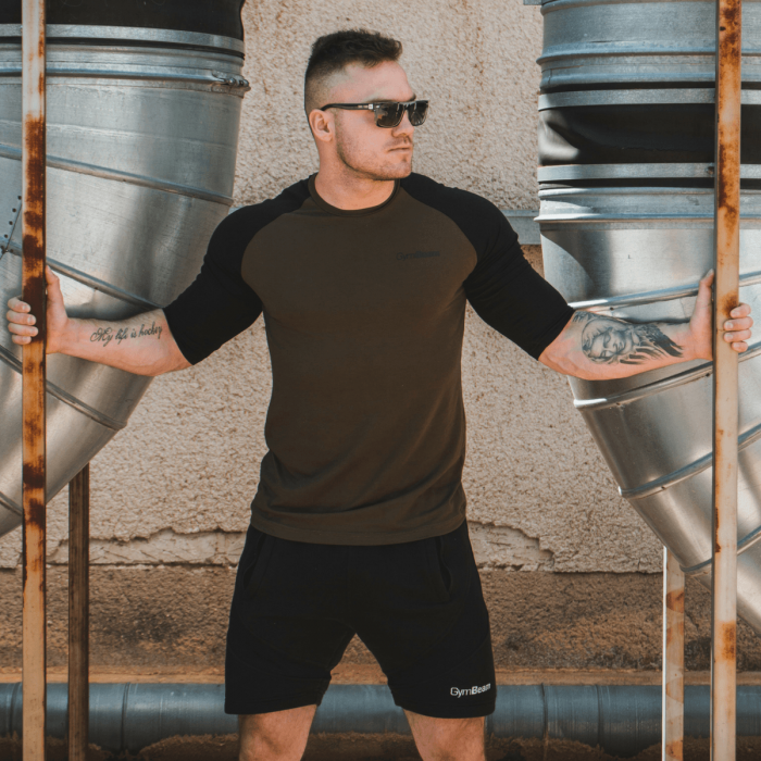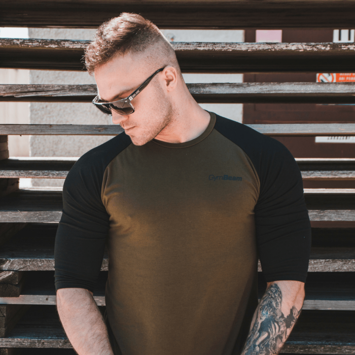 The men's T-shirt Fitted Sleeve Military Green Black GymBeam is a fitness t-shirt made of comfortable and breathable fabric. It has a modern cut that lets your worked-outhands stand out. It is also suitable for training as it is comfortable and adaptable to any sporting activity.