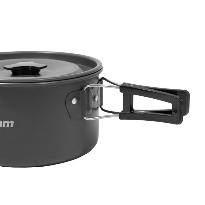 Outdoor Cookware Set is an outdoor camping cooking set that you mustn't be without while trekking or camping. It includes durable travel cookware in the form of a frying pan, kettle with lid and pot with lid. All parts of the set are made of lightweight and durable aluminium, which is ideal for outdoor use. It heats up quickly, saving time and fuel, while being strong enough to withstand normal impacts when carried in a pack or clipped on with a carabiner. This makes this set a great companion for any outdoor expedition. You can prepare a nutritious meal and beverage throughout the day that will fill you up, get you comfortable, warm you up, and help bring your outdoor moments to perfection.