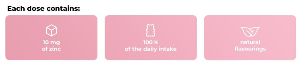 Zinc Yummies are delicious strawberry flavoured jelly gummies. With just one piece, you can support your immune system, as well as the health of your bones or eyesight. Zinc also helps maintain healthy hair, nails and skin. Enjoy its health benefits in this unique gummy form.